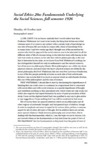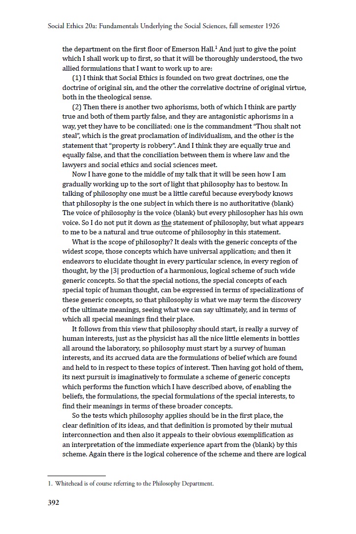 His participation in Richard Clarke Cabot’s Social Ethics seminar during the fall 1926 term is thus not especially unusual. The form of the record, however, is unique. It is not a manuscript of Whitehead’s, nor is it student notes of the kind we are used to seeing, but something that is arguably better than either of these: it is a professional stenographer’s recording of Whitehead’s presentation and the ensuing discussion. As to how this came to be, we believe that Cabot himself, being independently wealthy, must have hired someone to keep a record of the course’s proceedings.